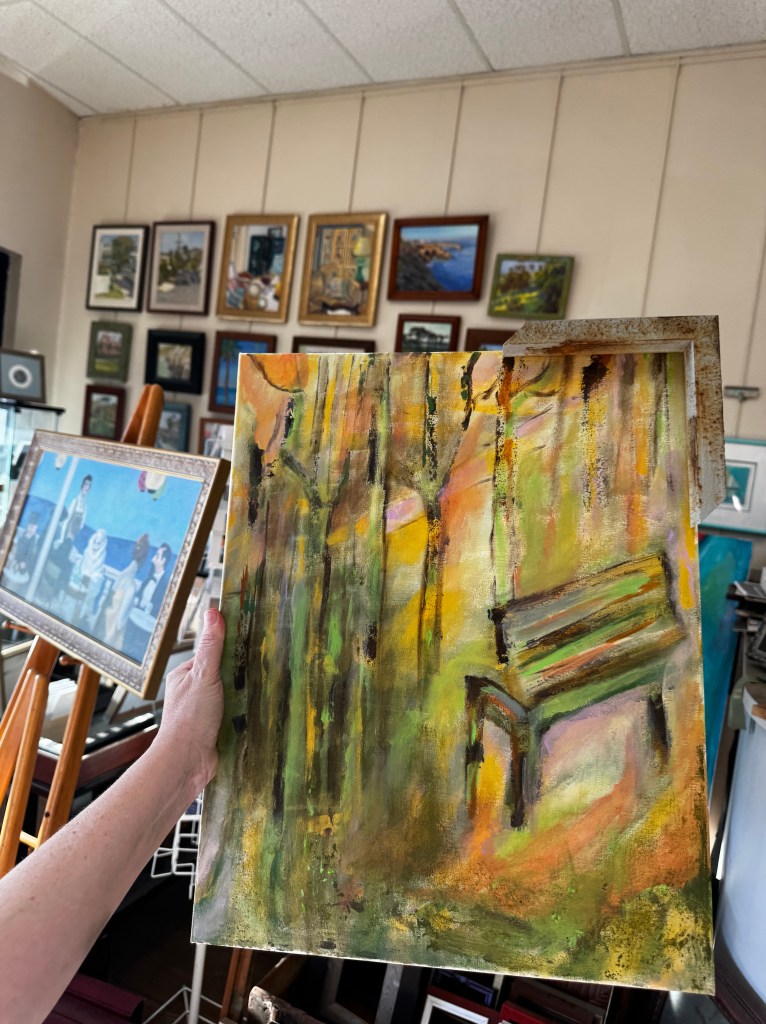 I returned from New York in November 2022 and immediately tried to mix some paint colors to emulate the smog and slop of Brooklyn when it was assaulted by melting snow. The figure is doing her own singing in the rain bit, wearing impractical couture when surrounded by puddles reflecting in the streetlamps, but entirely appropriate when summoning up the courage to walk through it. If you’ve been to Brooklyn in November, you will likely feel a crawling shiver from this scene that is neither pretty nor horrible.