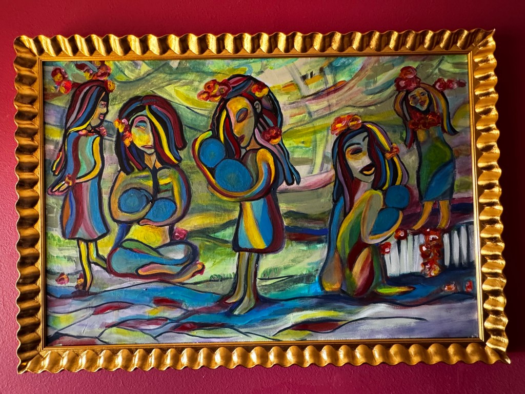 Description: In my therapy, I have been pushing gruesome and gory through me and out of me. When I felt too absorbed, I asked someone to tell me what they wanted me to paint. Technically, this is my first commissioned artwork. They said, “How about two hummingbirds sitting together?” I made it my own by adding a third hummingbird, a branch, a loving embrace, and metallic paints. The background is neon yellow and green and hangs on the wall outside the kitchen.